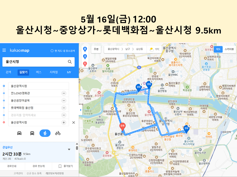 | 16 | 금 | 울산 | 12:00 울산시청~중앙상가~롯데백화점~울산시청 | 9.5 |