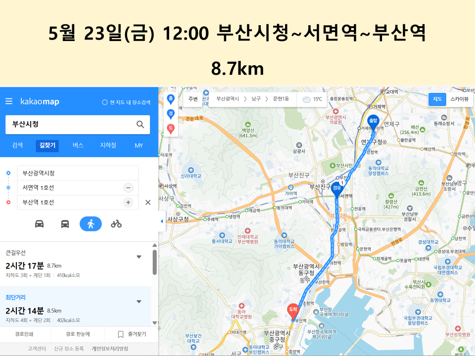 | 23 | 금 | 부산 | 12:00 부산시청~서면~부산역 (오후 4시 에너지전환 세미나 참석) | 8.7 |