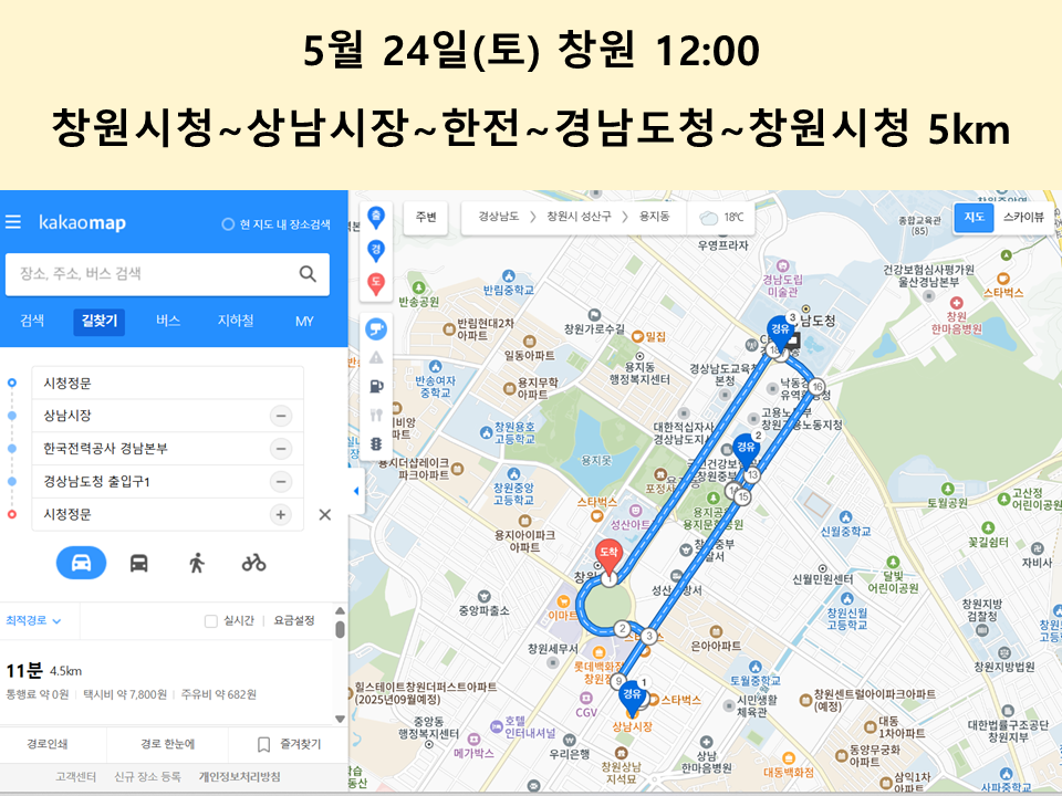 | 24 | 토 | 창원 | 12:00 창원시청~상남시장~한국전력~경남도청~창원시청 | 5.0 |