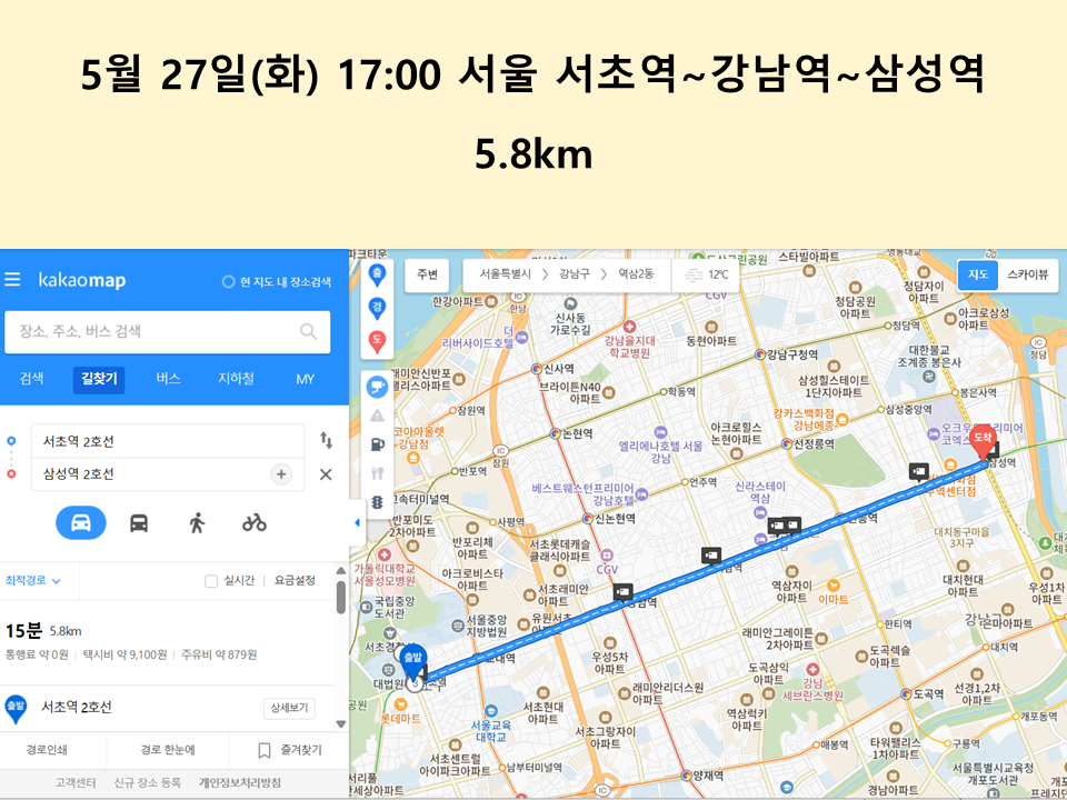 | 27 | 화 | 서울 | 17:00 서초역~강남역~삼성역 | 5.8 |