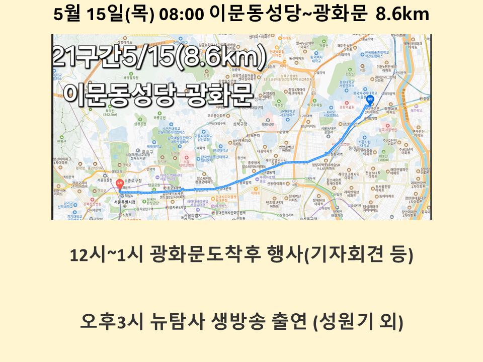 | 15 | 목 | 서울 | 오전 이문동성당~광화문 행사(12시) 2시반 광화문-신촌~홍대입구~합정역 | 8.0 7.2 |