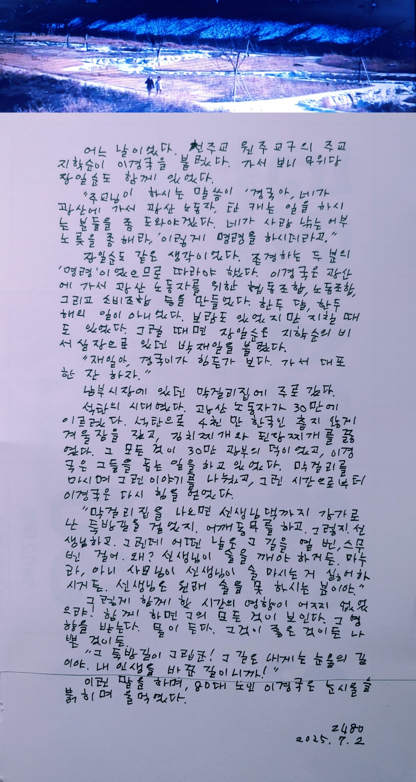 개구리의 엽서 2480/눈물의 길! 작성자우물 안의 개구리|작성시간25.07.02|조회수89 목록 댓글 0 글자크기 작게가 글자크기 크게가 다음검색 현재 게시글 추가 기능 열기 북마크 공유하기 신고 센터로 신고 댓글 댓글 0 댓글쓰기 답글쓰기 댓글 리스트