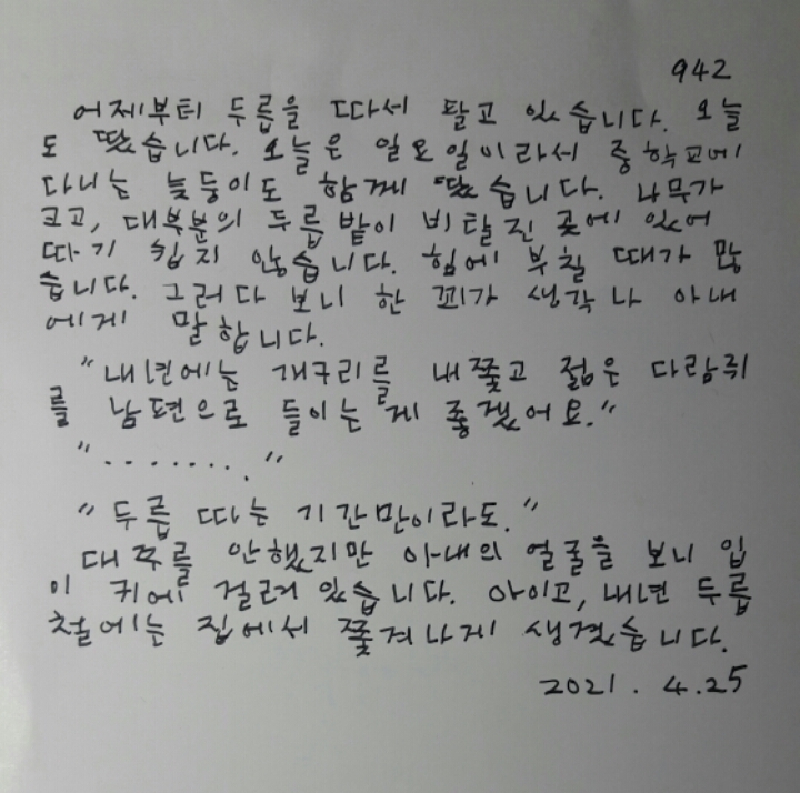 개구리의 엽서942/위기를 맞은 개구리 작성자개구리|작성시간21.04.26|조회수72 목록 댓글 2 글자크기 작게가 글자크기 크게가 개구리의 엽서 942 다음검색 현재 게시글 추가 기능 열기 북마크 공유하기 신고 센터로 신고 댓글 댓글 2 댓글쓰기 답글쓰기 댓글 리스트 작성자먼지민주 | 작성시간 21.04.26 저도 같이 따고 싶네요. 개구리 없을 때 불러주셔요!- 힘 쎈 먼지 - 작성자개구리 작성자 본인 여부 작성자 | 작성시간 21.05.02 먼지님답장이 늦어졌네요.아내가 다람쥐 들이게 어딘가 나가 보려해도 갈 곳이 없네요.ㅋㅋ 댓글 전체보기