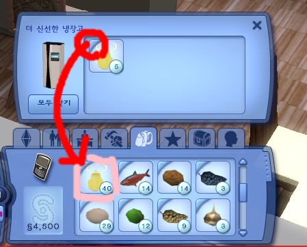 가방 속에 생명의 열매 45개 있네요. 동그라미 친 부분을 클릭한 채로 냉장고로 드래그하면 45개 모두 옮겨지지만