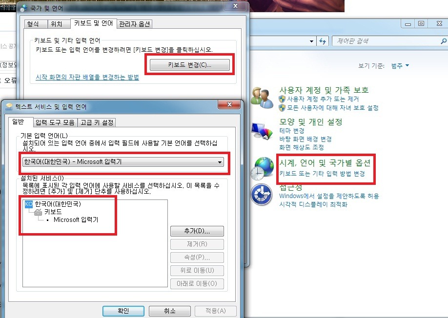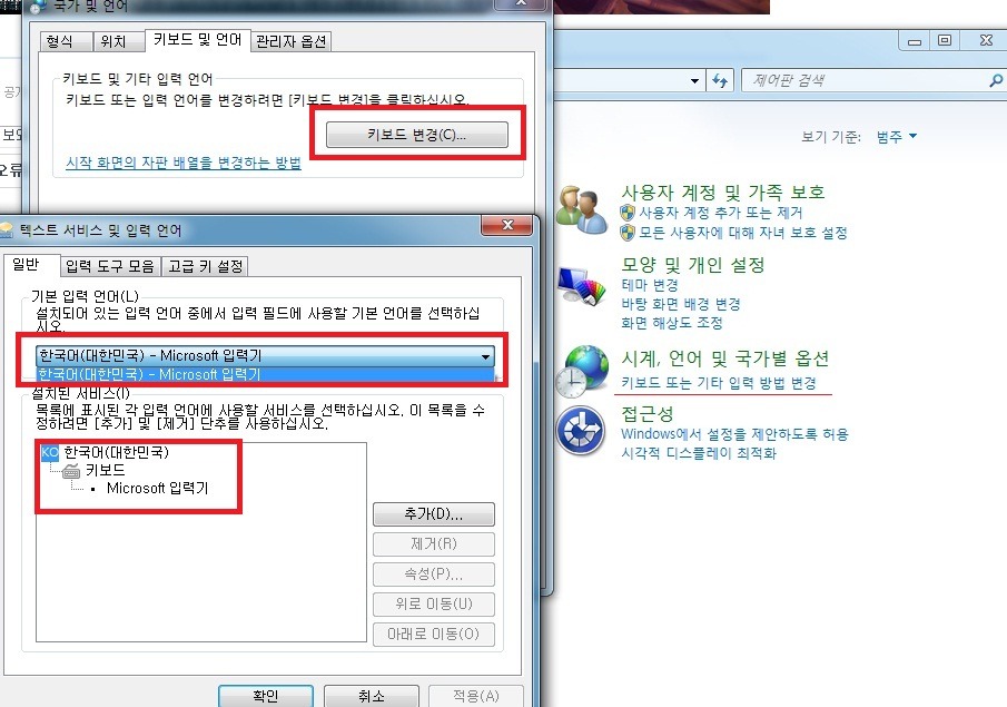 제가 빨간색으로 체크한 부분에 Microsoft 입력기 외에 한국어 입력기 또는 다른 언어로