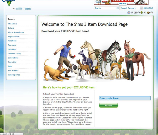 오리진 사이트에서 보낸 메일을 받으셨다면, 주소(www.thesims3.com/incentive/OriginPetsRedeem)로 가서 메일에 적힌 코드를 입력하고 8번에서 설명한 것처럼 The Store - My Account - Purchase History 경로로 가면 동물 의상을 받을 수 있습니다.