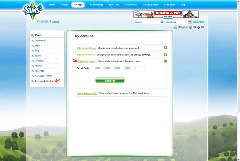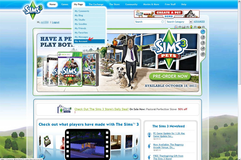 2. www.thesims3.com 사이트로 들어가 가입 후(가입방법설명글 : http://cafe.daum.net/easims/3Fqb/1193) 로그인 합니다. 그리고 상단 메뉴의 My Page - My Account 순서로 들어갑니다.