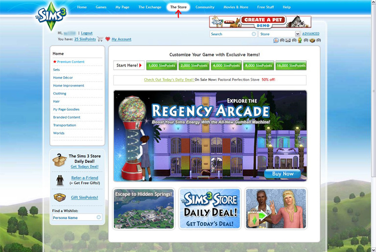 4. 상단 메뉴의 The Store를 누르거나 store.thesims3.com 주소로 들어갑니다.