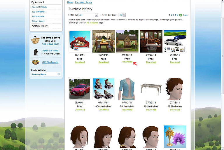 8. 아까 스토어 사이트 상단 메뉴에서 The Store - My Account - Purchase History 순서로 가시면 스토어에서 구입하여 다운로드했던 아이템들 목록이 떠서 나중에 언제든지 다시 다운받을 수 있습니다.