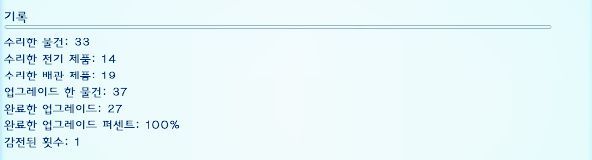 수리공 | 각자 다른 업그레이드 10개를 해야함. 업그레이드 한 물건 기록이 아닌 "완료한 업그레이드" 기록이 10개여야함. |