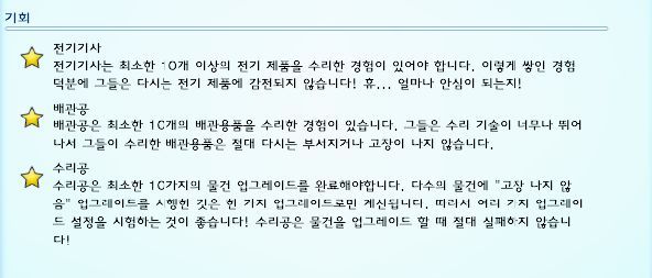 *전기기사와 배관공 타이틀을 따려면 집 안에 물건이 자주 고장이 나야합니다. 불운함 특성이 있는 심이 가족 구성원 중에 있다면 물건 고장을 잘 내는데 이것도 안 통하면 파티를 여세요. 심들이 이 물건 저 물건 고장내놓고 가더라구요. 혹은 손재주 기회카드로 배관 용품이나 전기 용품을 수리할 기회도 있습니다.