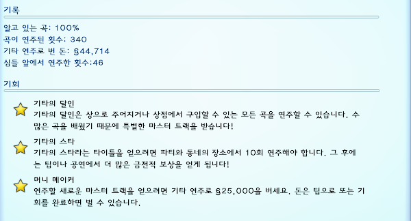 | [머니 메이커] 모잠이 있는 경우 지하철에서 팁을 버는게 젤 쉽습니다. 만약 오리지널의 팁 연주로 돈을 벌어 들이기 위해선 기록의 "곡이 연주된 횟수"를 높여야 합니다. 악보나 기술 향상으로 알게 된 연주곡을 공연한 횟수가 많아지면 많아질 수록 심들이 벌어들이는 기타 팁 수입이 많아지게 됩니다. |