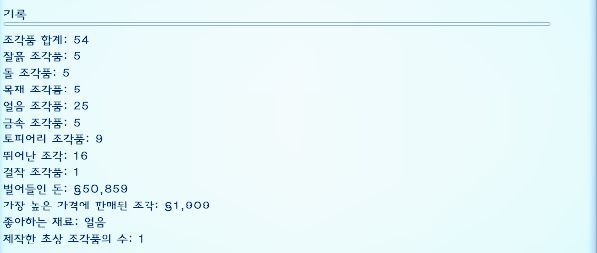 조각대 앞에서 오랫동안 연습한 끝에 사라는 이제 깜짝 놀랄만한 작품을 만들어내기 시작했습니다. 이제 그녀는 더 값어치가 나가는 뛰어난 조각품을 만들 가능성이 생겼습니다. | -뛰어난 조각품 만들기 시작함 |