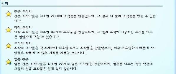-장인기술자(조각품 가격 상승 효과), 능숙한 판매자(위탁 상점 판매시 더 비싼 가격에 판매 가능,거의 가격이 2배로 껑충 뛰게 됨)