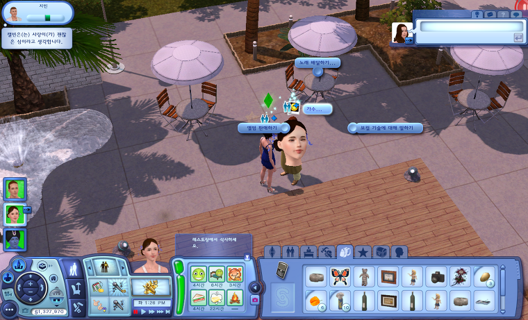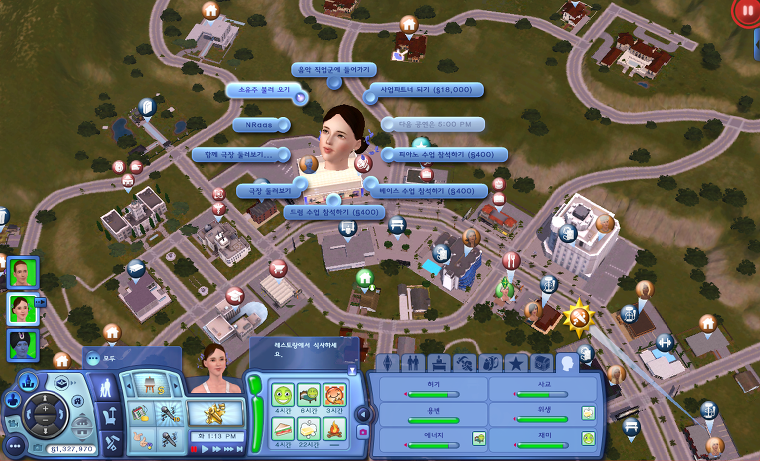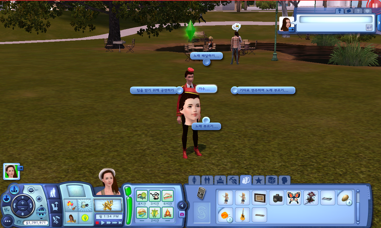 | [다른 심] 다른 심을 클릭했을 때도 [가수...]라는 메뉴가 보입니다. 레벨이 올라가면서 메뉴가 추가됩니다. -노래 배달하기 : 노래 배달하기 업무가 주어지지 않더라도 이 메뉴를 통해 노래 배달 업무를 할 수 있습니다. 단, 시몰레온은 벌어들이지 못하고 업무 성취도도 아주 미약하게 오릅니다..... -앨범 판매하기 : 레벨 4부터 다른 심들에게 앨범을 판매할 수 있게 되고, 앨범 한 개당 25시몰레온으로 팔리게 됩니다.-보컬 기술에 대해 말하기 : 레벨 5 가수가 되면 보컬 기술에 대해 말할 수 있습니다. 대화하는 상대 심과 친분을 2배 빨리 쌓을 수 있는 대화이면서 업무 성취도에도 반영이 되긴 합니다. |