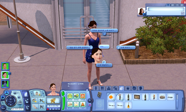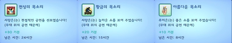 | [가수 심 자신] 가수 직업군에 들어가면 심에게 [가수..]라는 새로운 메뉴가 하나 생깁니다. 가수 심을 클릭해서 나오는 가수..메뉴는 주로 공연과 관련된 상호작용 메뉴입니다. -노래 부르기 : 가수 레벨이 올라갈수록 부를 수 있는 곡이 추가됩니다. 공연하기 할 때 부르는 곡들이 이 메뉴에 있는 곡이예요. -기타로 연주하며 노래부르기 : 심 인벤토리 안에 기타가 있어야 활성화되는 메뉴입니다. 노래 부르기와 달리 부를 수 있는 곡이 한정적이예요. -노래 배달하기 : 노래 배달하기 업무가 주어지지 않더라도 이 메뉴를 통해 노래 배달 업무를 할 수 있습니다. 단, 시몰레온은 벌어들이지 못하고 업무 성취도도 아주 미약하게 오릅니다..... |