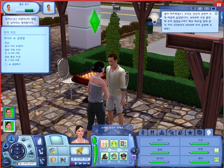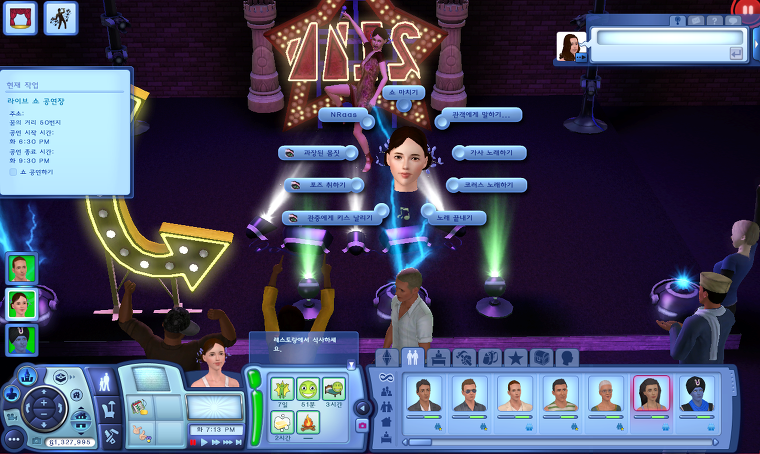 | ※공연 무대 오르기 각 공연장에는 공연장 "소유주"가 있습니다. 맵 모드에서 공연장 소유주의 지도 태그를 찾아 클릭하여 노래 오디션을 받으세요. 지도에는 현재 레벨에서 공연이 가능한 공연장의 소유주 태그만 보입니다. 빅 쇼 공연장의 경우 평상시에는 래빗홀 건물로 작동합니다. 빅 쇼 공연장의 소유주에게 오디션을 받기 위해서는 공연장 태그(파란색 태그)를 클릭해서 소유주를 불러와서 오디션을 받아야 합니다. 소유주와 친분이 두텁다고 해서 오디션에 통과하는 것은 아닙니다. 오로지 실력. (외쿡 게임답네요...) 오디션에 통과하는 경우 공연 일정에서 공연 장소와 시간을 확인할 수 있습니다. 고정 출연이 확정되기까지는 공연장에서 공연이 끝난 다음 소유주에게 오디션을 다시 받아야 합니다. 오디션을 통과하는게 조금 까다로운데 오디션 가능한 레벨보다 한 두단계 높은 레벨일 때가 되서야 오디션을 쉽게 통과할 수 있습니다. 고정 출연은 낮은 레벨의 공연장부터 확보가 되는 것 같은데 아무래도 공연 횟수와 가수 레벨이 일정 이상되고 공연의 결과가 성공적이면 고정 출연 확정이 되는 것 같아요. 고정 출연이 확정된 곳은 소유주를 통해 고정 출연 공연을 취소할 수도 있습니다. 전설의 보컬리스트가 공원에서 고정 출연하기엔 좀 그렇죠? 공연일정이 꽉 차면 높은 레벨 공연장의 소유주에게 오디션을 받지도 못하기 때문에 낮은 레벨 공연장의 고정 출연은 취소하고 높은 레벨 공연장을 위주로 일주일 내내 도는 것이 차라리 수익성이 좋습니다. | |
