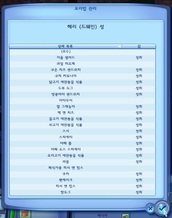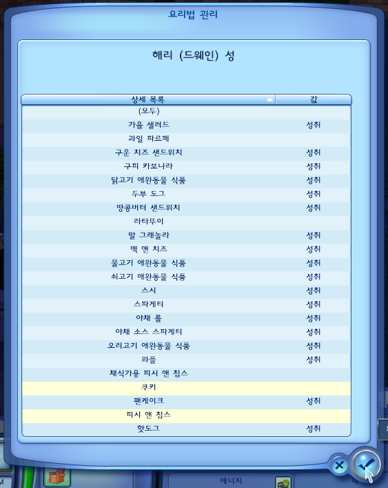 '성취'라고 써 있는 요리법은 이미 알고 있는 요리법입니다.