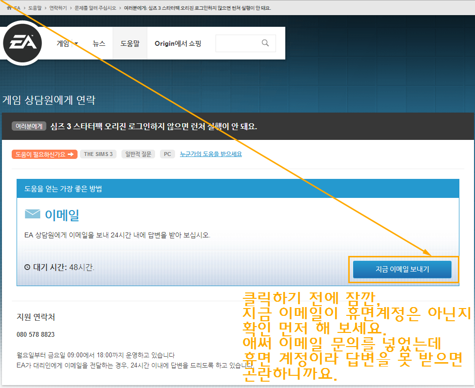 전 전화공포증 있어서 전화로는 뭘 잘 설명을 잘 못 하는데 EA가 도움말센터를 리뉴얼하더니만 갑자기 이메일 보내기가 사라져버려서 찾다가 찾다가ㅠㅠ결국 울며 겨자 먹기로 전화 문의넣게 되었어요. 그런데 이놈의 EA코리아 전화 통화 한번 하기 진짜 너무 힘든 거예요. 겨우겨우 아침에 업무시간 땡 치자마자 곧바로 전화 걸어서 간신히 연결이 되어서 전화 문의를 할 수 있었어요ㅠㅠ 막상 전화하니까 이메일 문의 보내는 법을 메일로 저한테 보내주시더라고요. 이메일 문의 찾아서 헤매고 계신 분들을 위해 공유합니다.