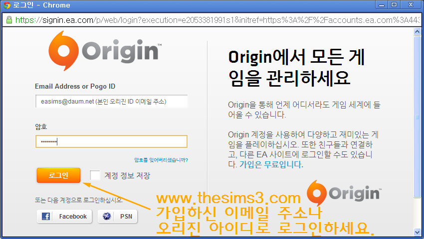www.thesims3.com (심즈 3 공식 홈페이지) 가입하셨던 이메일 주소나 오리진에서 심즈 3 게임 살 때 이용하셨던 계정으로 로그인하세요.