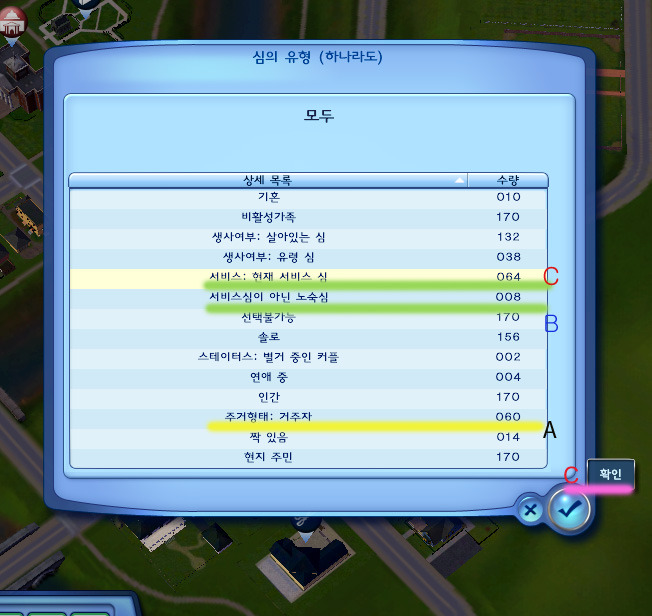 EA 에서 제공하는 마을(선셋벨리, 리버뷰, 몬테비스타, 럭키팜 등등) 은 기본적으로 마을인구가