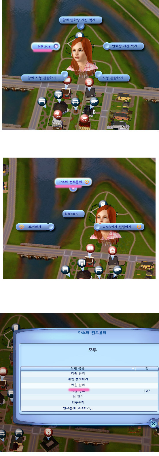 -> 시청> NRaas >'마스터 컨트롤러' > '마을관리' 눌러 줍니당