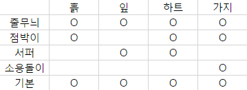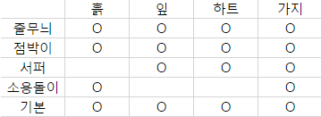 표를 딱보면 저기다 채워지는 놈들이 있겠거니 했는데 나중에 확인해보니 빈곳도 있었음 .....
