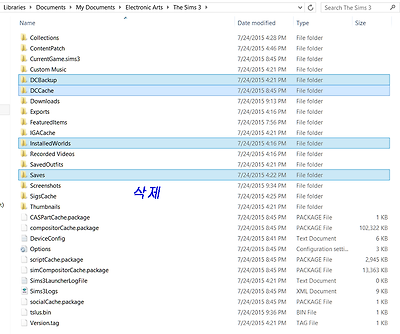 내문서/Electronic Arts/ 새로생긴 심즈 3 폴더에 있는 위에 것들을 삭제합니다.