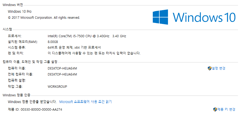 [ - (내)컴퓨터 오른쪽 클릭 - 속성을 들어가시면 프로세서(CPU), 메모리(RAM) 확인이 가능합니다.