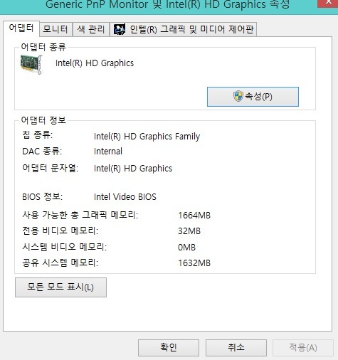 ② 바탕화면 오른쪽 클릭 - 화면 해상도 - 고급 설정에 들어가시면 어뎁터 종류에 그래픽카드가 뜹니다.]