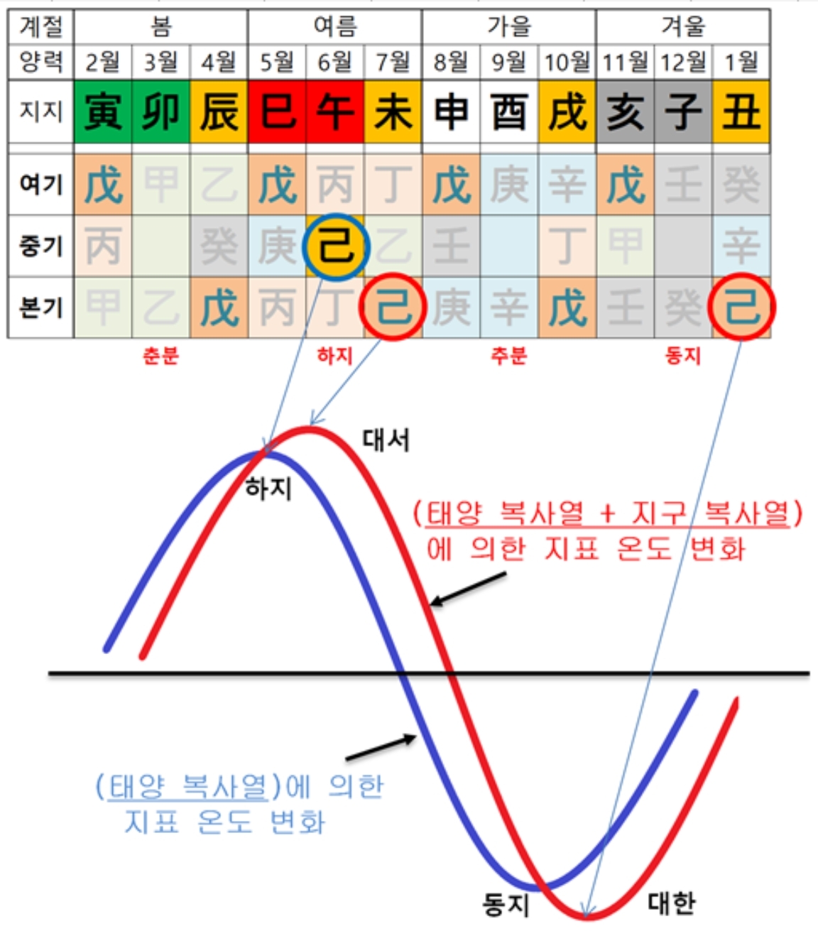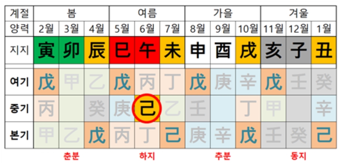 午중己토는 하지 때 태양이 남중고도를 이루는 상태를 표현한 것이다. 未중己토와 丑중己토는 태양의 복사열과 지구 복사열이 더해져 나타난 기후의 정점인 대서와 대한을 표현한 것이다.