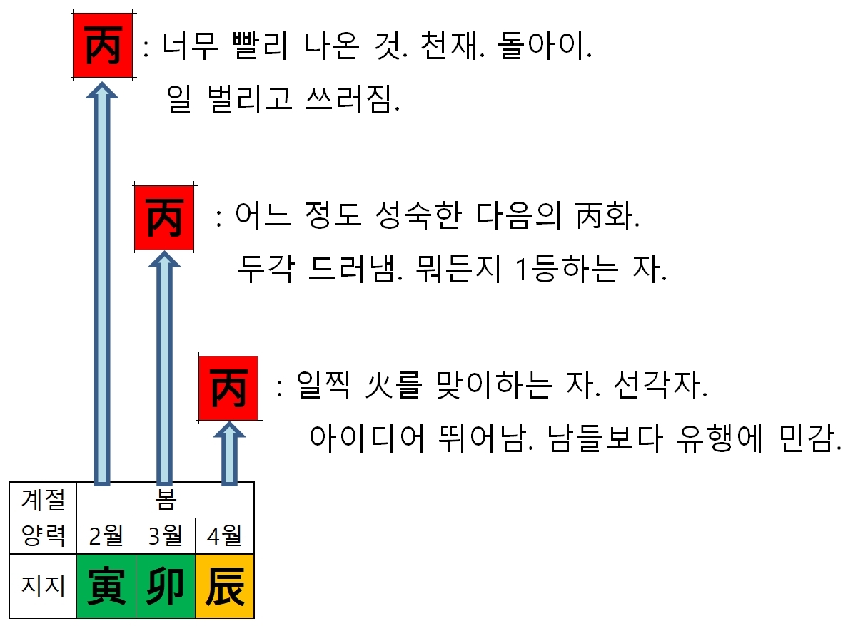 각 계절별 지지(월지)에 대해서 천간 丙화가 있는 경우, 선운의 해석을 참고해 보기로 한다.