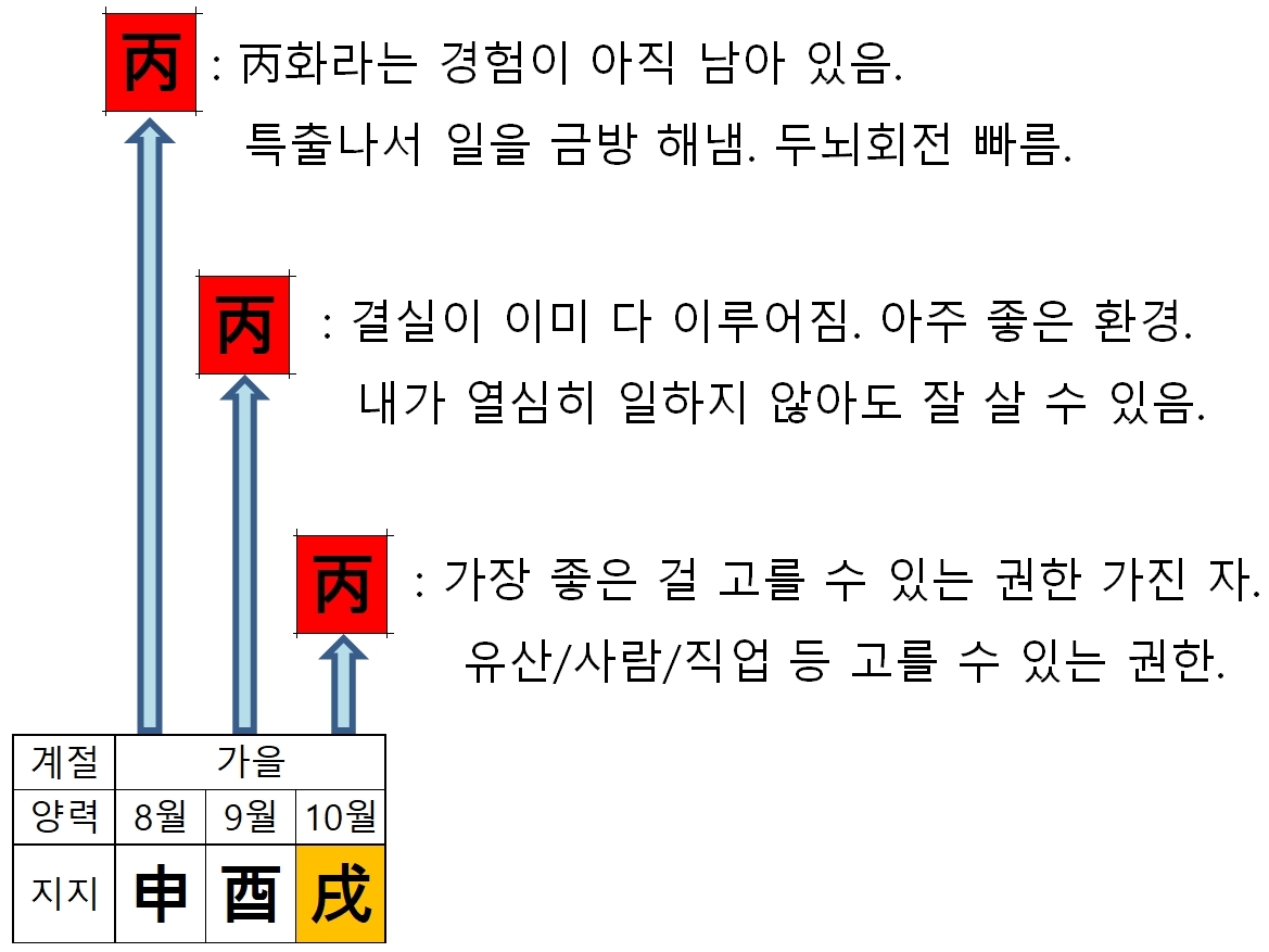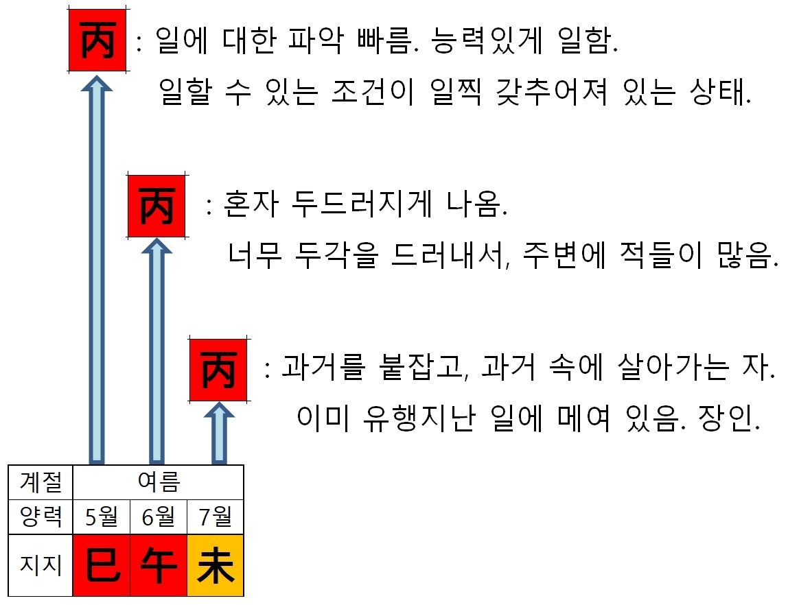특히 일간이 丙화인 경우 정신적으로 丙화의 성향을 가지게 되므로, 이것과 각 지지와의 상호관계를 이해하면 도움이 될 것이다. 궁통의 의미와 연계될 수도 있겠다.