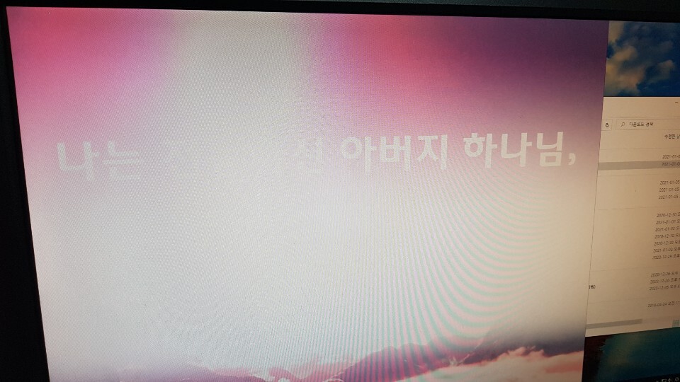 그러나 보니 그 찬송가 파일을 불러오면 잘 나오다가도 가운데에 자막이 들어가는 부분에 이미지 파일로 검은 박스로 출력되어 나옵니다(세번째 화). 처음에 찬송가를 여러장 선택하다보면 두번째 화면처럼 잘 나옵니다. 그러다가 이미 저장된 찬송가(사도신경)을 출력하면 3번째 화면처럼 계속 송출됩니다. 두번째 화면처럼 세팅할려고 합니다. 예전처럼 찬송가 화면에 이미지가 없는 파일로 되돌아갈수는 없는지요.