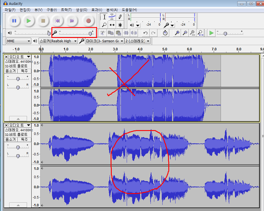 아래 사진을 보면 첫번째 녹음은 음량이 과하게 들어오고 있습니다. 진폰의 경계선을 넘은것이 보이지요?