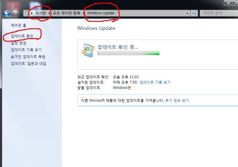 제어판-windows update 에 가셔서 아래 사진처럼 '업데이트 확인'을 클릭하시면 업데이트를 선택적으로 하실수 있습니다