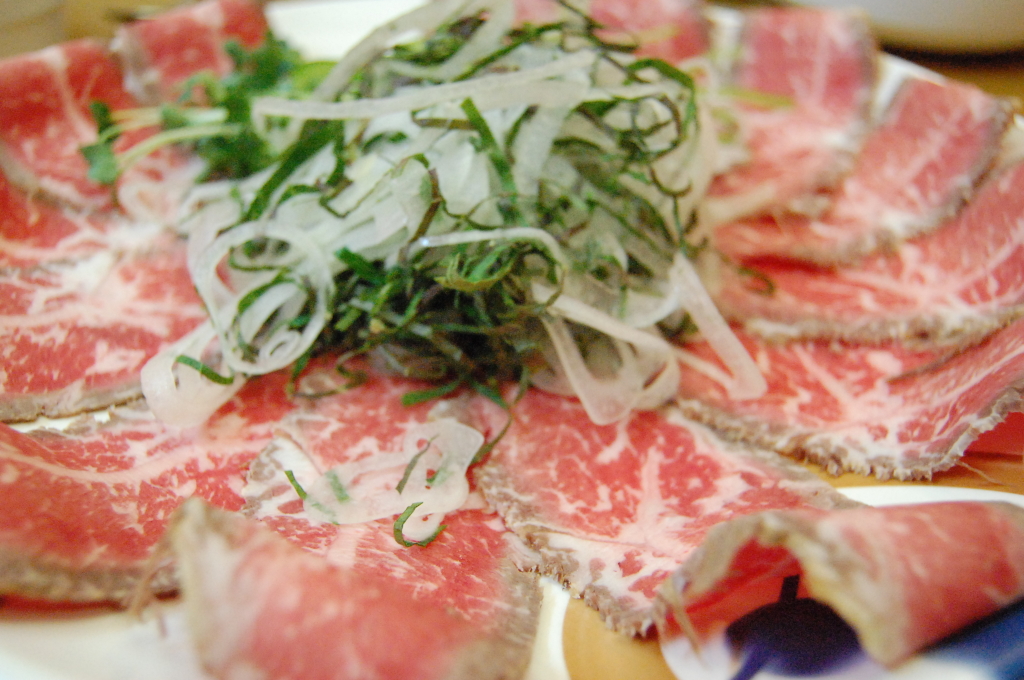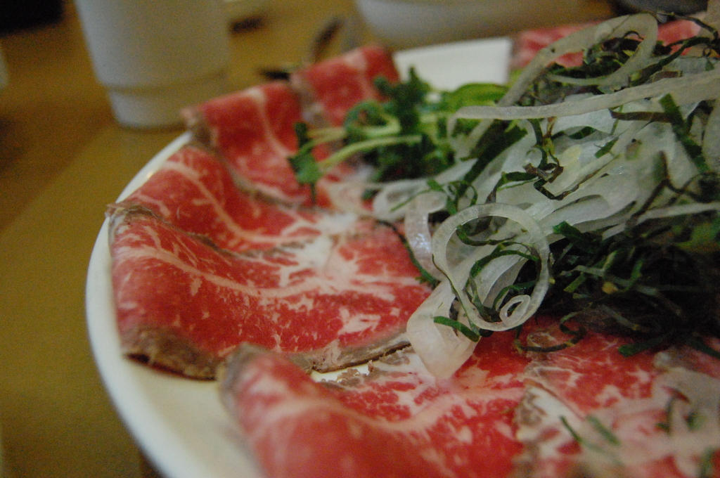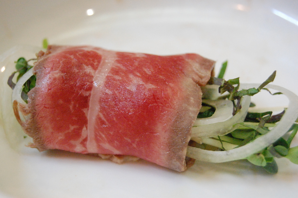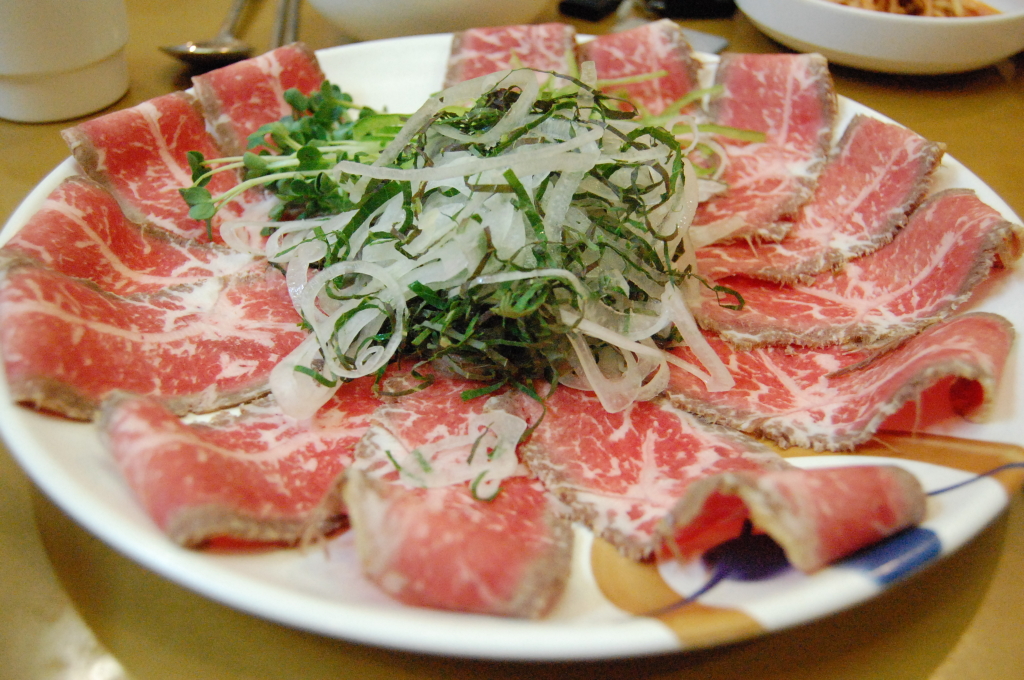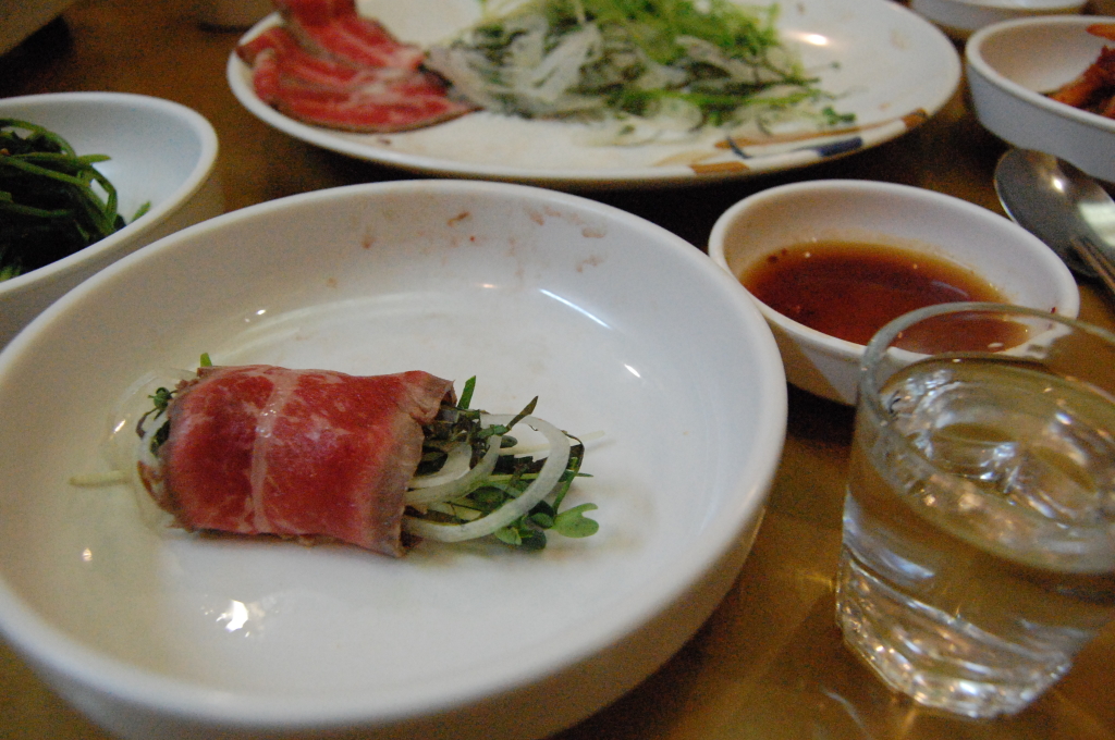 소고기를 살짝 얼려 시원함 맛과 깔끔한 야채의 맛을 쏘스에 살짝찍어.....