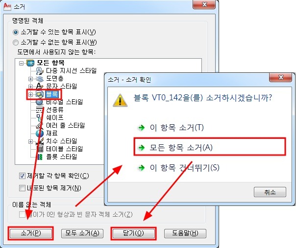 소거창에서 '모두소거'하시면 도면층에 정의되었던 폰트 스타일과 치수 스타일 등의 보이지않는 명명된 객체까지