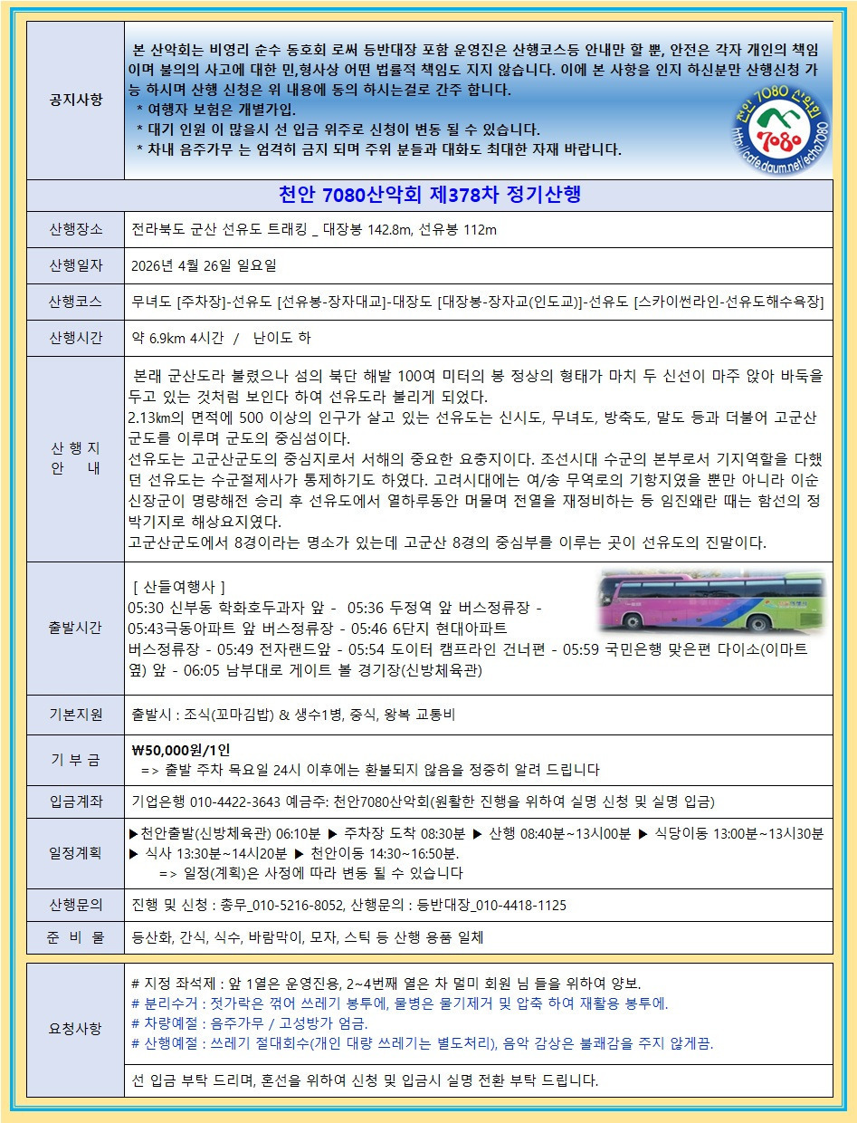 천안7080산악회 제 378차 정기산행을 아래와 같이 공지 하오니 많은 참여 부탁 드립니다.