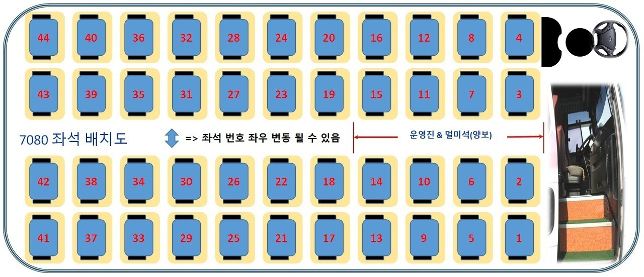 ▣ 좌 우 좌석 배치 : 차량 배차에 따라 좌, 우 좌석이 변동 시 번호에 상관없이 신청하신 위치에 앉으시면 됩니다.