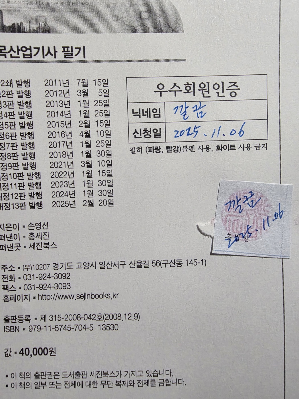 회원시청(첨부사진 수정) 작성자깔끔|작성시간25.11.07|조회수26 목록 댓글 1 글자크기 작게가 글자크기 크게가 다음검색 현재 게시글 추가 기능 열기 북마크 공유하기 신고 센터로 신고 댓글 댓글 1 댓글쓰기 답글쓰기 댓글 리스트 작성자세진북스 | 작성시간 25.11.08 우수회원 등업 완료. 꼭 합격하세요.^^우수회원 자격기간은 평생입니다.책으로 공부중에 오타나 오답이 있는 경우에는 질문방에 올려주시면저자분이 바로 답변 드리도록하겠습니다.^^ 댓글 전체보기
