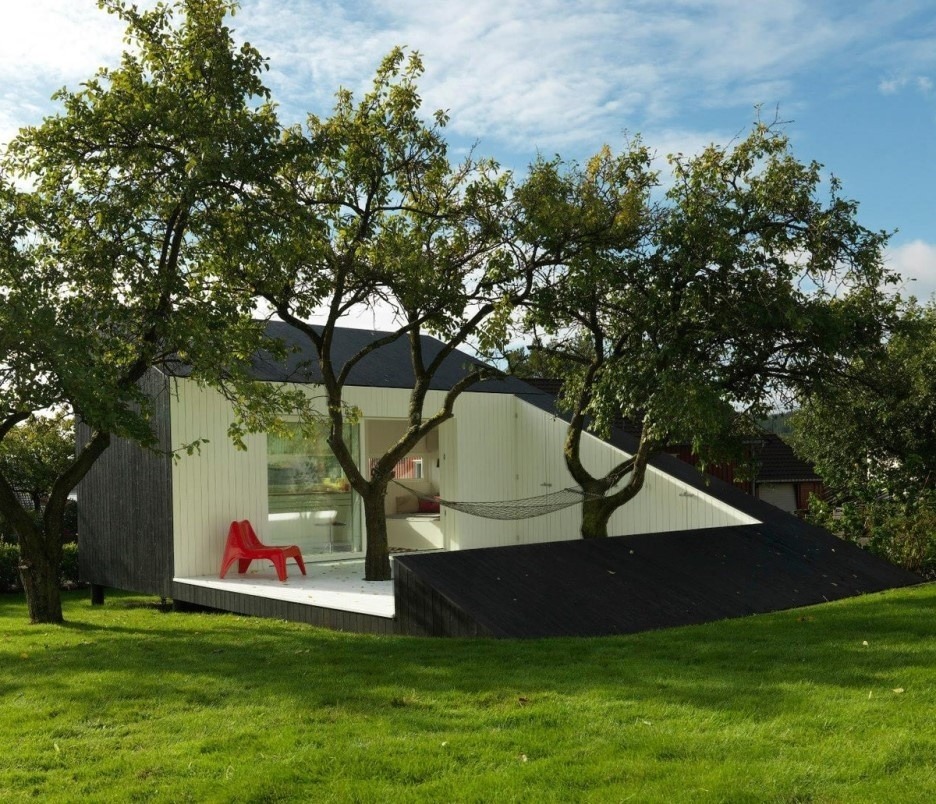 쉐이드지붕 구조로 집과 테라스 이어낸 담장이 하나로 어울어져