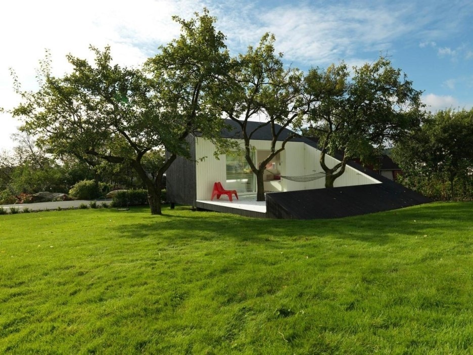 호수가있는 파란잔디밭에 네츄럴한 느낌의 소형 주택.