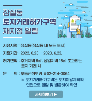 잠실동 토지거래허가구역 재지정 알림 작성자향나무|작성시간22.06.22|조회수8 목록 댓글 0 글자크기 작게가 글자크기 크게가 다음검색 현재 게시글 추가 기능 열기 북마크 공유하기 신고 센터로 신고 댓글 댓글 0 댓글쓰기 답글쓰기 댓글 리스트