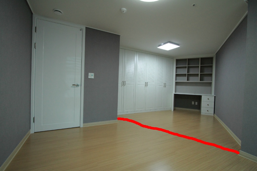 위 사진에서 보시다시피 원래 방의 크기는 적색선까지가 원 크기 입니다. 숨은 공간 확장을 통해서 방이 두 배 가까이 넓어 졌습니다.