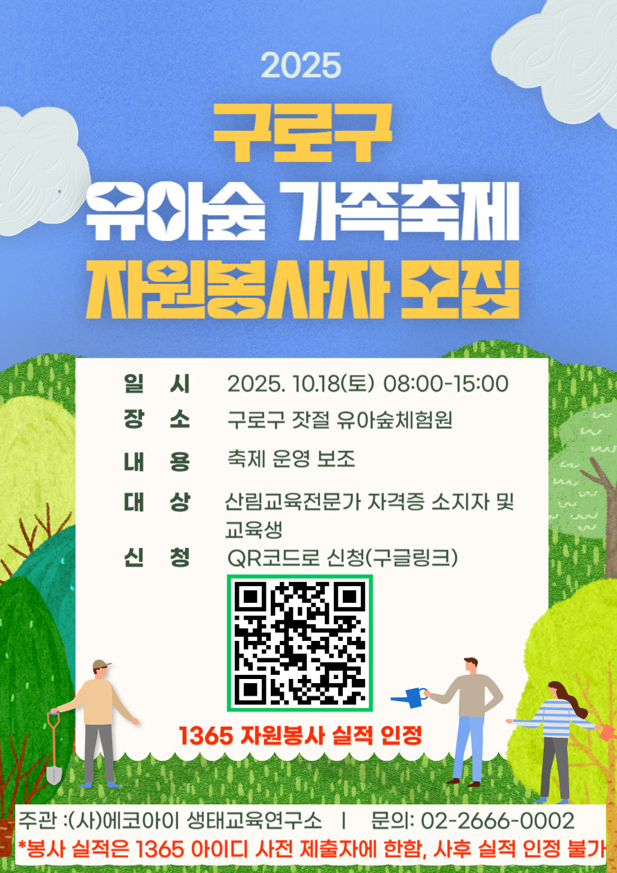 [공지]2025년 구로구 유아숲 가족축제 자원봉사자 모집 (10/14까지 : 선착순 마감) 작성자에코아이|작성시간25.09.25|조회수187 목록 댓글 1 글자크기 작게가 글자크기 크게가 다음검색 현재 게시글 추가 기능 열기 북마크 공유하기 신고 센터로 신고 댓글 댓글 1 댓글쓰기 답글쓰기 댓글 리스트 작성자에코아이 작성자 본인 여부 작성자 | 작성시간 25.09.30 14일 17시까지 줌회의 안내문자를 받지 못하신 분은 사무국으로 전화주셔서 접수여부를 꼭 확인해 주세요!!(신청이 누락되는 경우가 있습니다^^) 댓글 전체보기