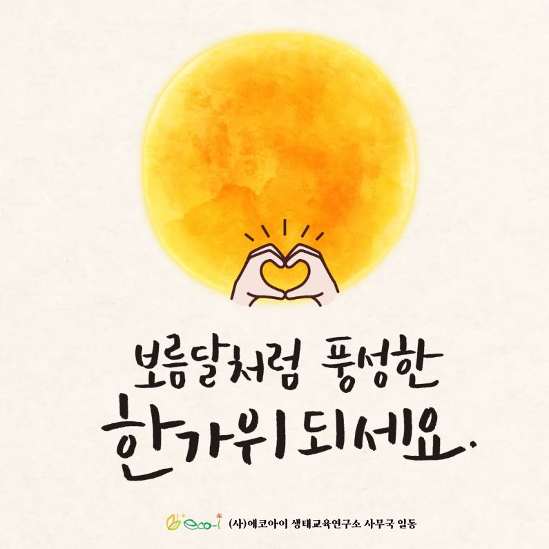 2025년 추석맞이 인사드립니다^^ 작성자에코아이|작성시간25.10.02|조회수97 목록 댓글 0 글자크기 작게가 글자크기 크게가 에코아이 생태교육연구소와 함께해 주시는 모든 분들께 감사드립니다.풍성한 한가위처럼 마음도 풍성해지고,가족과 함께 행복하고 따뜻한 명절 보내세요! 🌕🌿 다음검색 현재 게시글 추가 기능 열기 북마크 공유하기 신고 센터로 신고 댓글 댓글 0 댓글쓰기 답글쓰기 댓글 리스트