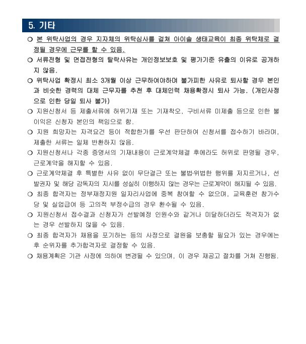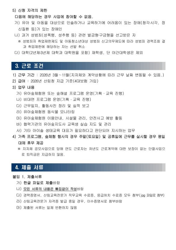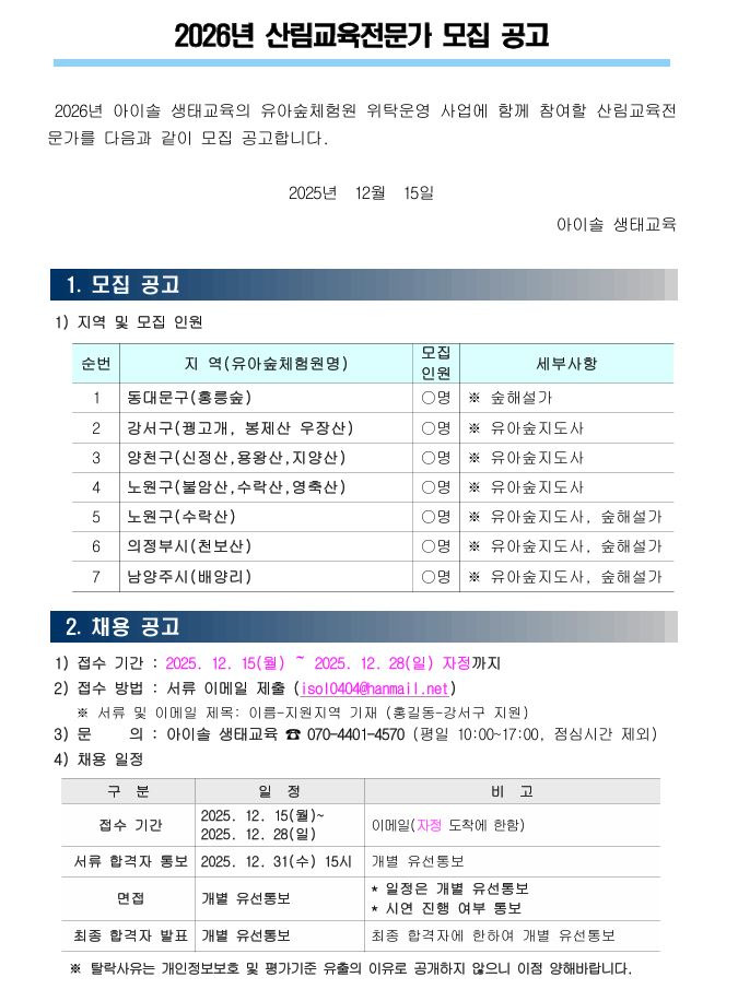 [협약기관_아이솔 생태교육] 2026년 산림교육전문가 모집 작성자에코아이|작성시간25.12.15|조회수807 목록 댓글 0 글자크기 작게가 글자크기 크게가 붙임1. 제출서류(아이솔 생태교육).hwp22.00KB*** 제출서류 확인바랍니다 *** 첨부파일첨부된 파일이 5개 있습니다. jpg 파일 2026상근자모집공고포스터.jpg 다운로드 etc 파일 3.JPG 다운로드 hwp 파일 붙임1. 제출서류(아이솔 생태교육).hwp 다운로드 etc 파일 1.JPG 다운로드 etc 파일 2.JPG 다운로드 다음검색 현재 게시글 추가 기능 열기 북마크 공유하기 신고 센터로 신고 댓글 댓글 0 댓글쓰기 답글쓰기 댓글 리스트