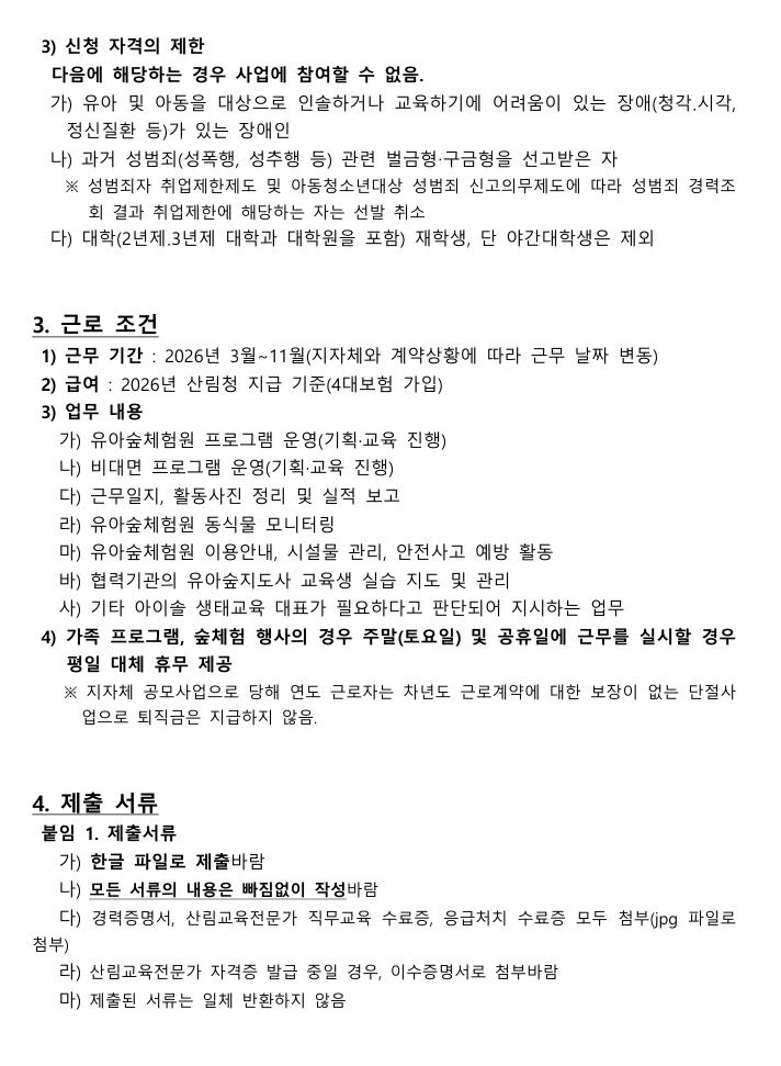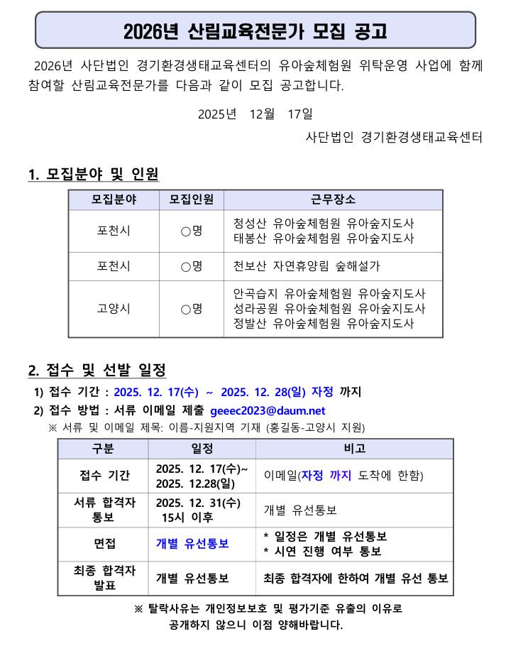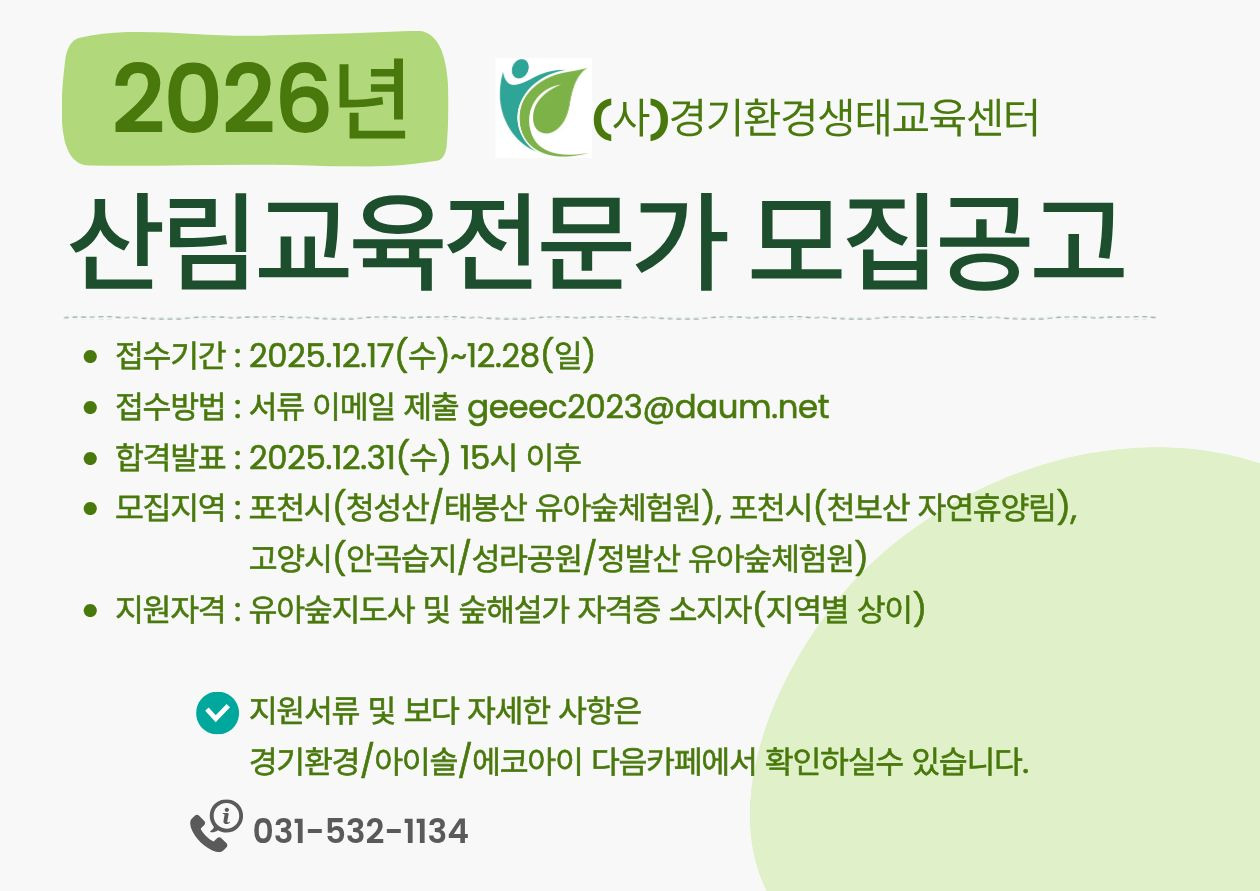 [협약기관_경기환경생태교육센터] 2026년 산림교육전문가 모집 공고(프로그램 계획서 제출 필수) 작성자에코아이|작성시간25.12.17|조회수324 목록 댓글 0 글자크기 작게가 글자크기 크게가 붙임1. 제출서류(경기환경생태교육센터).hwp21.50KB*** 제출서류 확인바랍니다 *** 첨부파일첨부된 파일이 5개 있습니다. etc 파일 2.JPG 다운로드 etc 파일 1.JPG 다운로드 etc 파일 3.JPG 다운로드 hwp 파일 붙임1. 제출서류(경기환경생태교육센터).hwp 다운로드 jpg 파일 2026상근자모집공고(경기환경).jpg 다운로드 다음검색 현재 게시글 추가 기능 열기 북마크 공유하기 신고 센터로 신고 댓글 댓글 0 댓글쓰기 답글쓰기 댓글 리스트