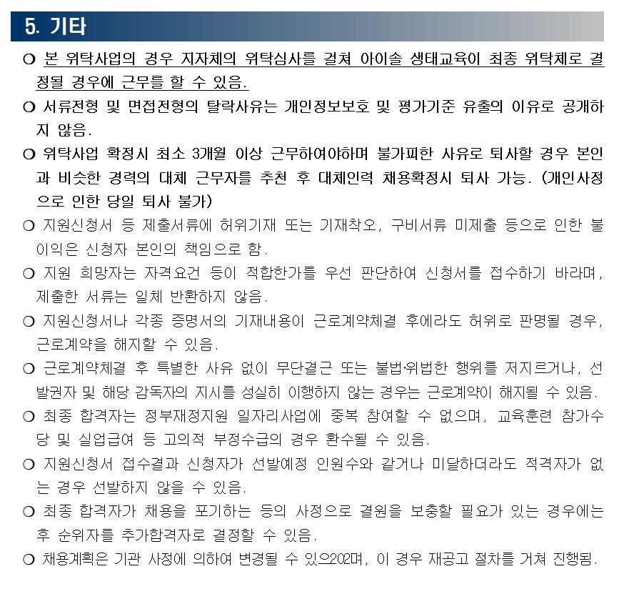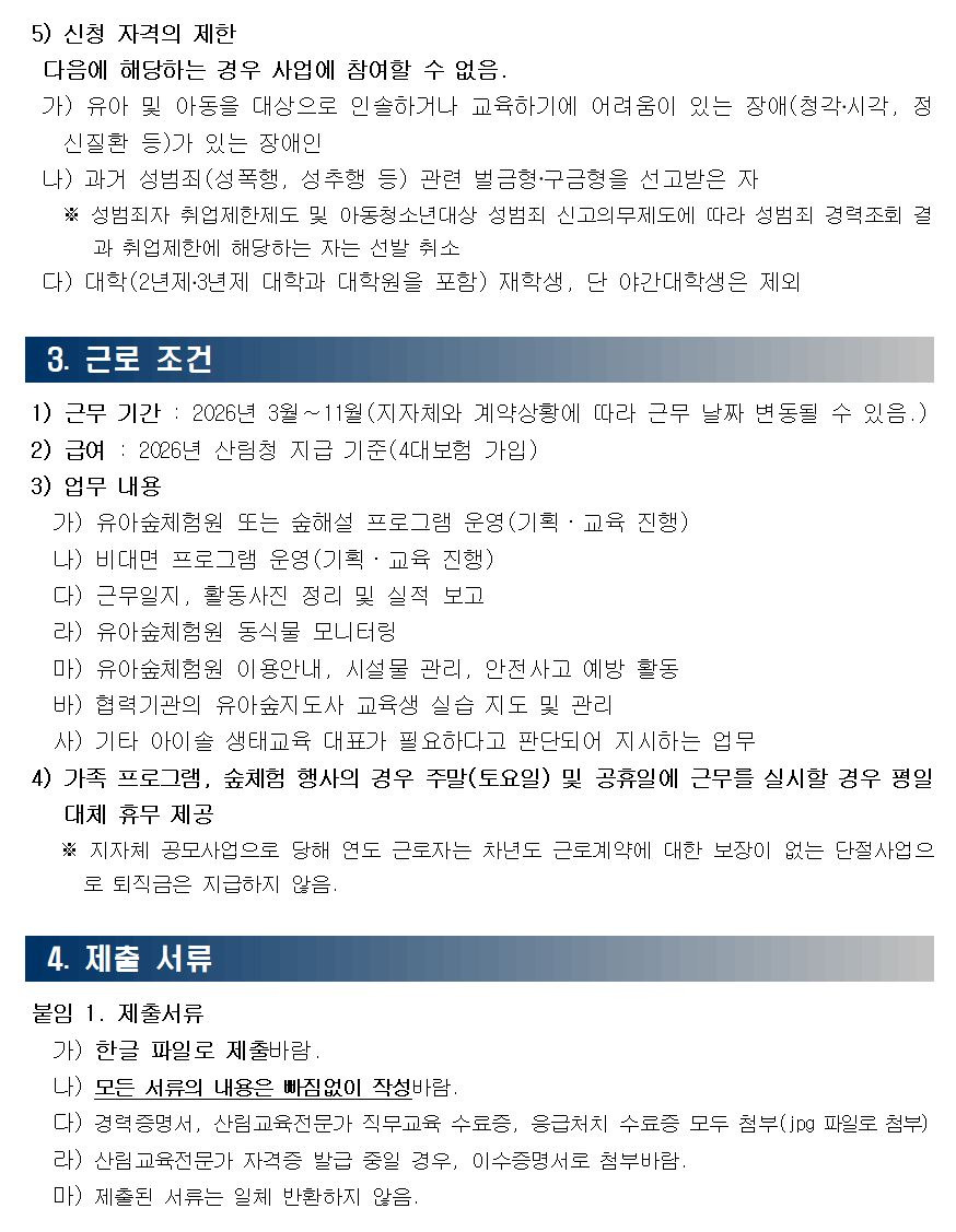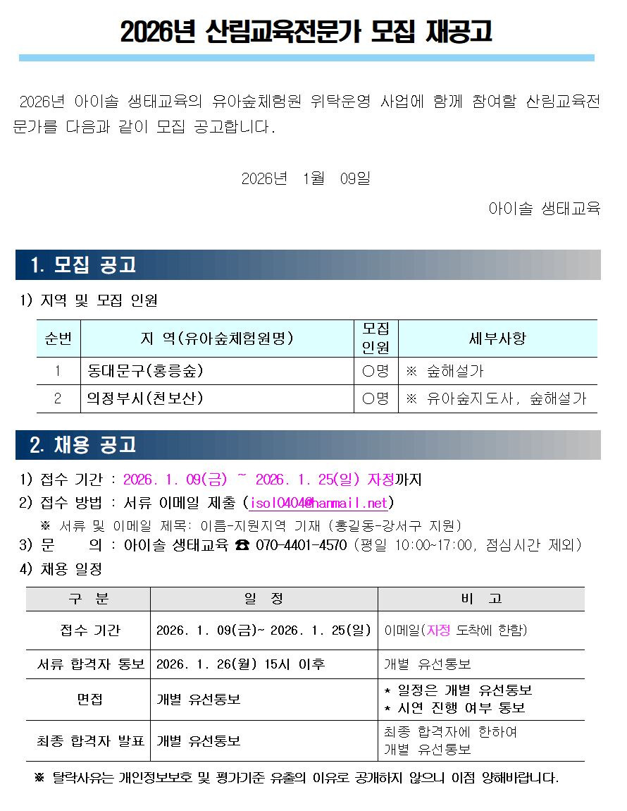 [채용][협약기관] 아이솔 생태교육 2026년 산림교육전문가 모집(의정부시/홍릉숲) 작성자에코아이|작성시간26.01.09|조회수493 목록 댓글 0 글자크기 작게가 글자크기 크게가 제출서류(필수)붙임1. 제출서류(아이솔).hwp22.00KB 첨부파일첨부된 파일이 4개 있습니다. etc 파일 재공고1.JPG 다운로드 etc 파일 재공고2.JPG 다운로드 etc 파일 재공고3.JPG 다운로드 hwp 파일 붙임1. 제출서류(아이솔).hwp 다운로드 다음검색 현재 게시글 추가 기능 열기 북마크 공유하기 신고 센터로 신고 댓글 댓글 0 댓글쓰기 답글쓰기 댓글 리스트
